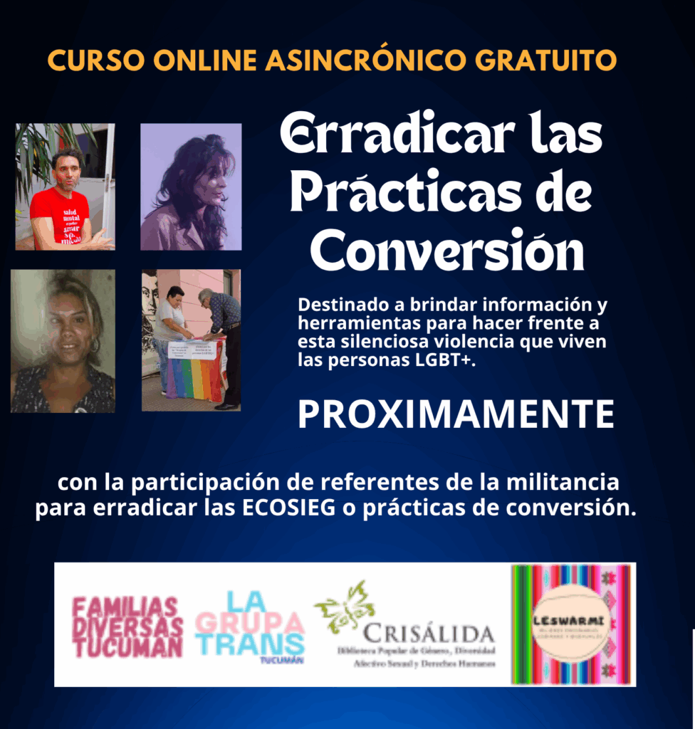 El 30 de octubre a las 10 am en el Honorable Concejo Deliberante de San Miguel de Tucumán, el consorcio EDIEdu (Leswarmi; Familias Diversas Tucumán; La Grupa Trans y Crisálida) presentaremos el curso online, asincrónico, virtual y gratuito para contribuir a la erradicación de las Prácticas de Conversión.